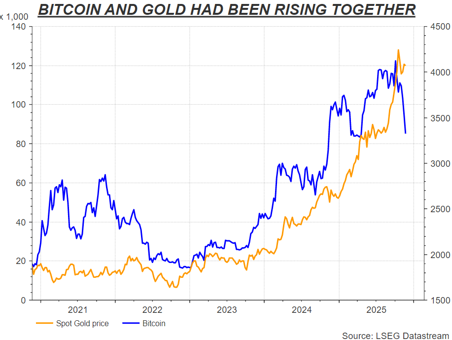 两者的共同叙事是对主要货币超发和贬值的担忧,买家声称囤积这两类资产是基于“价值储存”考虑,因其供应有限而非固定收益。然而比特币等加密代币虽在过去十年爆发式增长,但仍然极度波动且高度投机。今年秋季,即便针对主要货币的焦虑转向日元,比特币却跟随科技股“风险规避”抛售,六周内暴跌约三分之一。