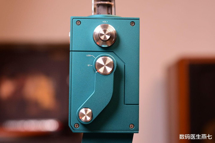 ▲机身左侧展示,顶部“耳朵”可用来调音量,单击即可;下方胳膊则是切换USB输入和蓝牙输入模式的。